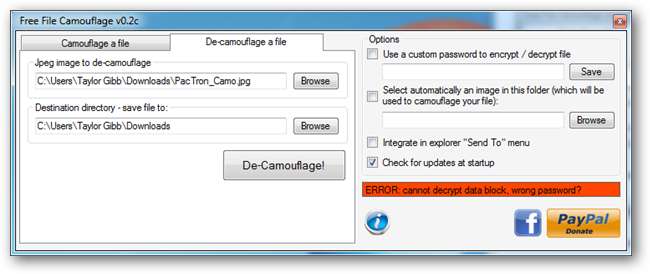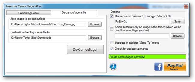 Voit palauttaa tiedostosi siirtymällä naamioinnin välilehdelle, valitsemalla kuvan, muista merkitä ruutu ja syöttää sama salasana, jota käytit tiedoston salaamiseen. Jos käytät väärää salasanaa, tiedostoa ei voida purkaa ja saat virheilmoituksen.