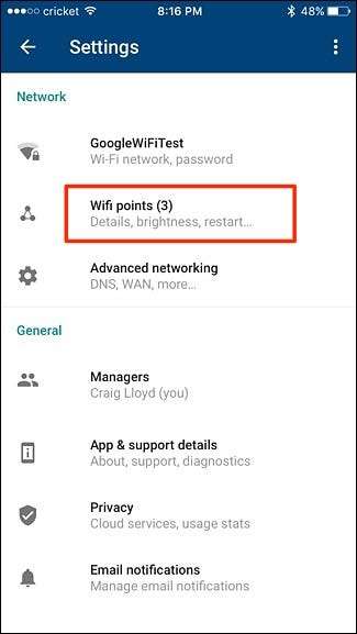 Aloita avaamalla Google WiFi -sovellus puhelimellasi ja napauttamalla oikeanpuoleista välilehteä, jossa on asetuskuvake ja kolme muuta ympyrää.