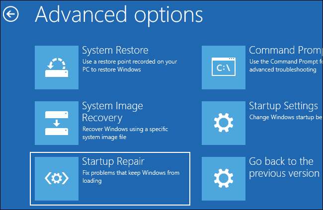 Windows 8: ssa tai 10: ssä näet usein Käynnistyksen lisäasetukset -valikossa jos Windows ei voi käynnistää kunnolla. Voit käyttää Käynnistyskorjausta napsauttamalla Vianmääritys> Lisäasetukset> Käynnistyksen korjaus tässä valikossa.