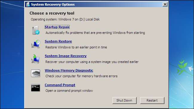 Windows 7: ssä näet Korjaa tietokone -linkin samassa paikassa. Napsauta tätä ja Windows suorittaa käynnistyskorjaustyökalun.