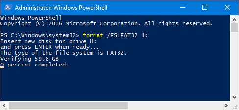 komento PowerShellissä tai komentokehotteessa - komento käyttää samaa syntaksia molemmissa työkaluissa. Tämän tekemisen haittapuoli on, että se voi kestää kauan. 64 Gt: n USB-aseman alustaminen kesti melkein yli tunnin, ja olemme kuulleet joidenkin ihmisten valittavan, että isommille asemille voi kulua useita tunteja. Ajan pituuden lisäksi et myöskään tiedä, onnistuiko alustaminen - epätodennäköistä, mutta mahdollista -, ennen kuin prosessi on valmis.