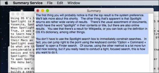 Kun Yhteenveto on käytössä, pääset siihen valitsemalla tekstin asiakirjassa ja siirtymällä sitten uudelleen Palvelut-valikkoon. Valitse valikossa Yhteenveto. Se on kaikki mitä sinun on tehtävä tulevaisuudessa; se on vain yhden napsautuksen (tai pikanäppäimen) päässä.