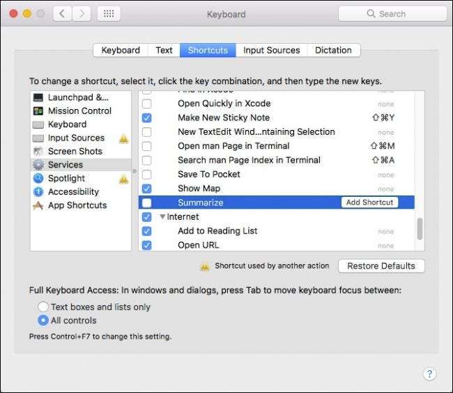 Tämä vie sinut Näppäimistö-asetusten Pikavalinnat-välilehdelle. Varmista, että vasemman ruudun Palvelujen pikavalinnat on valittu, ja vieritä sitten oikeanpuoleisessa ruudussa Tekstipalvelut-kohtaan.