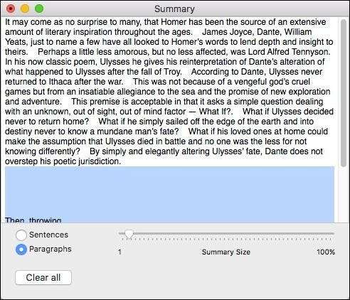 Kun suoritat Summarize-palvelun, se avautuu erilliseen ikkunaan. Nyt voit tehdä yhteenvedon lauseilla tai kappaleilla. Säädä yhteenvedon kokoa oikealla olevalla liukusäätimellä.