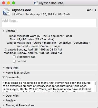 Kun olet tallentanut yhteenvedon (tai yksinkertaisesti kopioinut sen), voit tehdä sen kanssa mitä haluat. Voit esimerkiksi sijoittaa sen tiedostokommentteihisi. Saatat joutua muuttamaan yhteenvetoa hieman, jos siinä on yli 749 merkkiä, muuten se ei mahdu macOS: n kommenttiosioon.