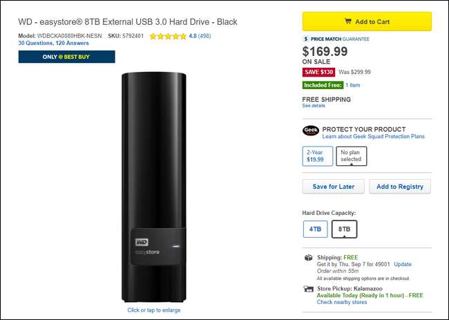 Tällä hetkellä (ja koko vuoden 2017 ajan) paras arvo ajokytkennässä on ollut johdonmukaisesti edellisessä osassa käytetty esimerkki: 8TB Western Digital Easystore ulkoinen USB 3.0 -kiintolevy . Käytännössä joka toinen viikko asema on myynnissä Best Buy -palvelussa ~ 170 dollaria ja sisältää Western Digital Red -aseman.
