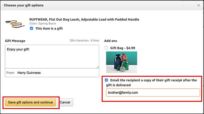 Kumpi vaihtoehto otat, sinun on esitettävä Lisää lahjavaihtoehdot -näyttö, kun kassalle. Jos haluat lisätä lahjakortin, tarkista "Sähköposti vastaanottajalle kopio lahjakudestaan, kun lahja toimitetaan" Valintaruutu, lisää sähköpostiosoitteensa ja valitse sitten "Tallenna lahjavaihtoehdot ja jatka."