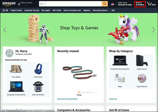 Päätä Amazon ja klikkaa "Palautukset & amp; Tilaukset "sivun oikeassa reunassa.