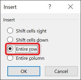 Kun rivit on valittu, paina Ctrl + Shift + Plus (+ Sign) samanaikaisesti tietokoneessa tai komento + Shift + Plus (+ Sign) Macissa. Tämä avaa "insert" -ruutuun. Valitse tässä ruutuun "Koko rivi" ja napsauta "OK".