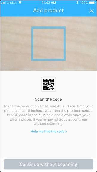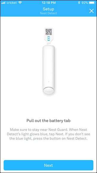 Aivan kuten Nest Guardissa, anturiin on liitetty QR-koodi, jonka voit skannata. Kun olet skannannut, osoita sovelluksen Seuraava-painiketta aloittaaksesi antureiden asettamisen.