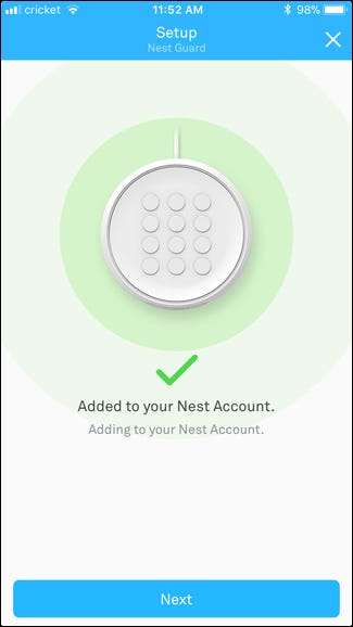 Kokeile tunnistetta sijoittamalla se Nest Guardin lähelle. Jos se toimi, se antaa merkkiäänen ja valo muuttuu vihreäksi. Napsauta sovelluksessa Seuraava.