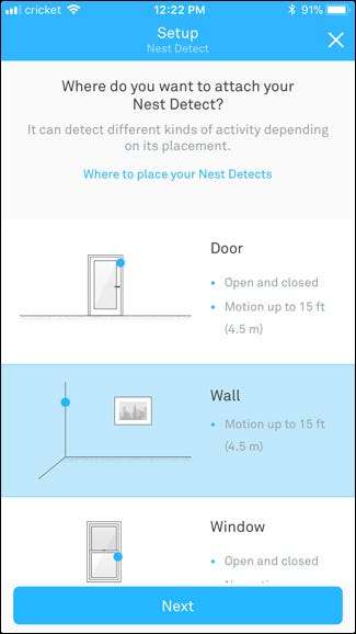 Valitse seuraavaksi paikka, johon aiot sijoittaa anturin joko ovelle, seinälle tai ikkunaan. Valitsemalla yhden määritetään, mitä aktiviteetteja anturi voi havaita ja tarvitsetko avaus- / kiinni-magneettia. Aion valita "Seinä" ja sitten "Seuraava".