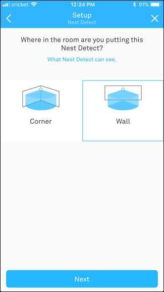 Sen jälkeen aion valita anturin tarkalleen joko nurkkaan tai vain suoraan seinälle jonnekin. Napsauta "Seuraava", kun olet valinnut yhden.