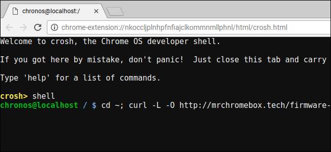Tämä komento muuttuu kotihakemistoksi, lataa http://mrchromebox.tech/firmware-util.sh komentosarjatiedosto ja suorittaa sen pääkäyttöoikeuksilla.