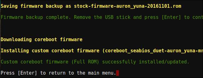Kun varmuuskopiointi on valmis, komentosarja lataa korvaavan Coreboot-laiteohjelmiston ja vilkuttaa sen Chromebookille. Sammuta Chromebook, kun se on valmis.
