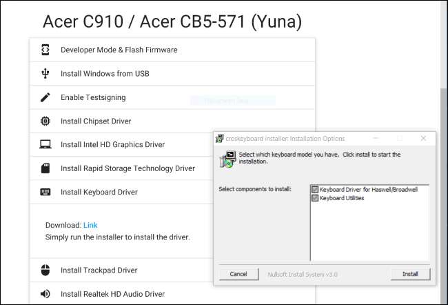 Voit nyt asentaa kolmannen osapuolen ohjaimet, joita Chromebookin asennusopas suosittelee Chromebook-mallillesi. Esimerkiksi Acer C910 Chromebookissamme jouduimme asentamaan ohjaimet Chromebookin piirisarjalle, Intel HD -näytönohjaimelle, pikatallennustekniikalle, näppäimistölle, ohjauslevylle ja Realtek HD -äänelle.