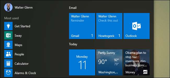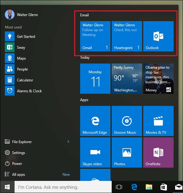 Se on kaikki mitä sinun on tehtävä. Jos katsot Käynnistä-valikkoa, sinun pitäisi nyt nähdä ylimääräinen live-ruutu, joka edustaa kyseistä tiliä.