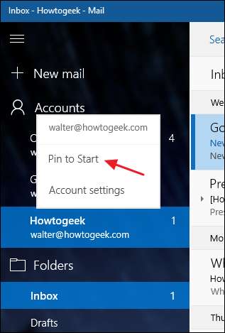 Voit myös kiinnittää minkä tahansa Mail-sovelluksen kansion Käynnistä-valikkoon samalla tavalla. Napsauta vain hiiren kakkospainikkeella kansiota, valitse "Kiinnitä alkuun", ja siihen kansioon toimitetut uudet viestit näkyvät heidän omassa live-ruudussaan. Kyllä, se on yksinkertainen temppu. Mutta jos käytät live-ruutuja, voi olla todella kätevää nähdä näin erotetut viestit. Ja se on helppo unohtaa.