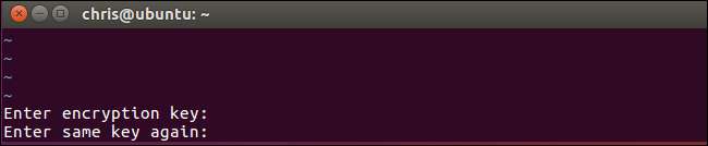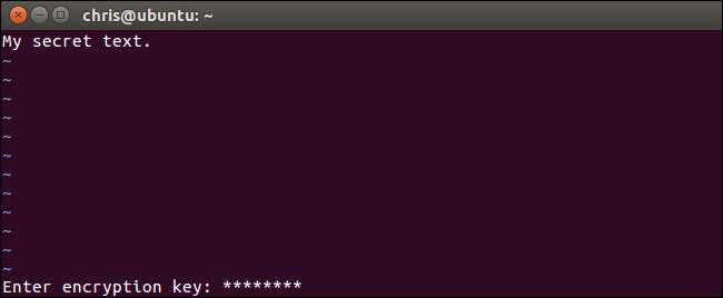 ", Voit suorittaa seuraavan komennon saadaksesi VIM: n luomaan tai avaamaan tiedoston ja tekemään sen heti kehotuksen salaamaan tiedosto salasanalla: