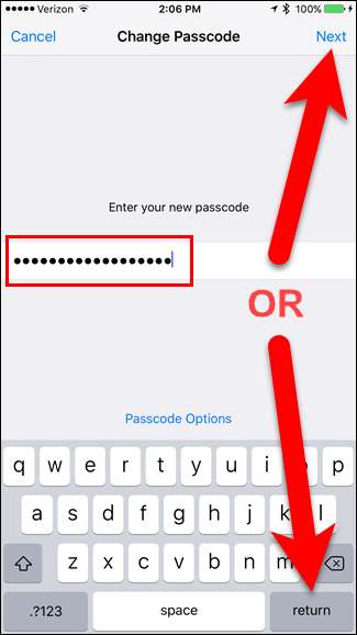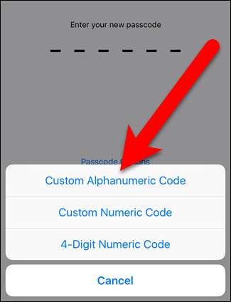 Kolme vaihtoehtoa, joiden avulla voit asettaa nelinumeroisen numerokoodin (kuten iOS: ssä ennen versiota 9), mukautetun numeerisen koodin (sallii pidemmän vain numeroita käsittelevän koodin) tai mukautetun aakkosnumeerisen koodin. Napauta “Mukautettu aakkosnumeerinen koodi”.