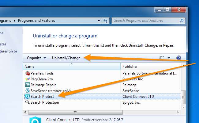 Siirry nyt Ohjauspaneeliin, etsi Poista ohjelmat -osa, etsi Search Protect ja napsauta Poista-painiketta. Täällä ollessasi saatat haluta poistaa kaikki muut, jotka sanovat jotain samanlaista kuin "Search Protect". Jos näet SaveSense, poista myös se.