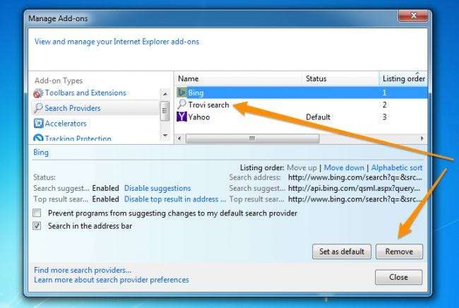 Jos käytät Internet Exploreria, siirry Työkalut-valikkoon ja etsi Lisäosien hallinta -kohde. Täällä voit napsauttaa hakupalveluja ja muuttaa hakusi takaisin sellaiseksi kuin sen pitäisi olla. Jos näet luettelossa Trovin, napsauta sitä ja napsauta sitten Poista.