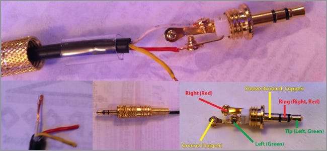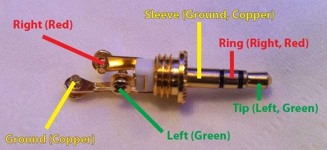 Useimmissa äänikaapeleissa ja kuulokkeissa on läpi kolme tai neljä johtoa: punainen, vihreä / sininen ja paljas / kupari. Jos on neljä, kertoimet ovat kaksi paljaita / kuparisia. Punainen on oikea kanava, vihreä tai sininen on vasen kanava ja paljas johto on maa. Nämä värit voivat olla erilaisia, mutta oikea kanava on melkein aina punainen, ja maa on yleensä kuparinvärinen, ellei se ole paljas.