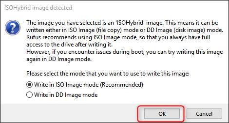 Tällöin pitäisi ilmestyä valintaikkuna, jossa kerrotaan, että tiedosto on ISOHybrid-kuva, minkä vuoksi se voidaan kirjoittaa kahdella tavalla: ISO- tai DD-kuvana. Oletus- ja suositeltava menetelmä - ISO-kuva - tulisi valita etukäteen. Jatka eteenpäin ja vahvista valitsemalla "OK".