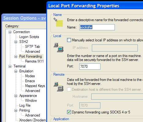 Tämä HowTo olettaa, että sinulla on jo SSH-palvelin ja osaat muodostaa yhteyden siihen. Ensin siirryt Options \ Session Options -valikkopaneeliin ja napsautat SSH-edelleenlähetystä. Napsauta Lisää-painiketta ja täytä valintaikkuna näin: