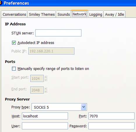 Useimmat ihmiset ymmärtävät jo, että pikaviestien käyttö työstä on helppo seurata ja kirjata. Jos sinulla on pääsy SSH-palvelimeen missä tahansa (minun on talossani), voit asettaa nopean SOCKS-välityspalvelimen välittämään kaiken liikenteen kotisi SSH-palvelimen kautta, eikä työnantaja edes tiedä, että olet keskustelemassa tarkkailemalla verkko.