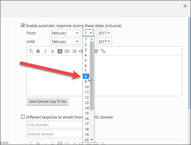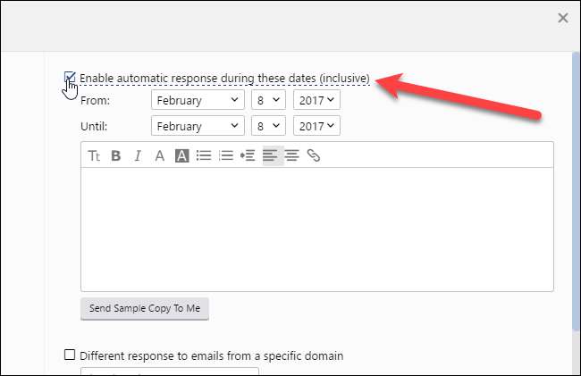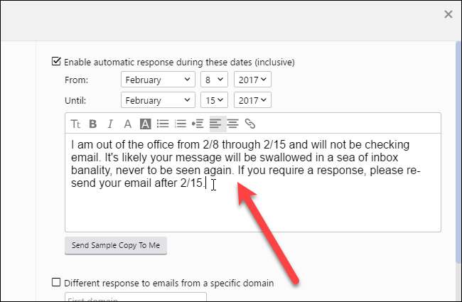 Jos haluat käyttää eri viestiä vastaamaan yhden tai kahden tietyn verkkotunnuksen sähköposteihin, voit määrittää sen erikseen. Ehkä haluat lähettää hauska tai älykäs viesti kaikille paitsi ihmisille, joiden kanssa työskentelet. Jos haluat määrittää heille toisen viestin, valitse "Eri vastaus tietyn verkkotunnuksen sähköposteihin" -ruutu. Kirjoita sitten kyseisten sähköpostiosoitteiden verkkotunnus valintaruudun alapuolelle. Jos haluat esimerkiksi lähettää erilaisen vastauksen kaikille sähköpostiosoitteille osoitteilla henkilö@yritysyritys.com, kirjoita