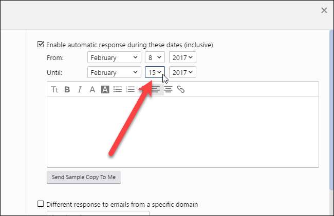 Koska asetat lomavastaukselle ajanjakson, jos unohdat poistaa loma-vastaus-ruudun valintaruudun, automaattisen vastauksen lähettäminen lopetetaan edelleen valitsemasi päivämäärän jälkeen.