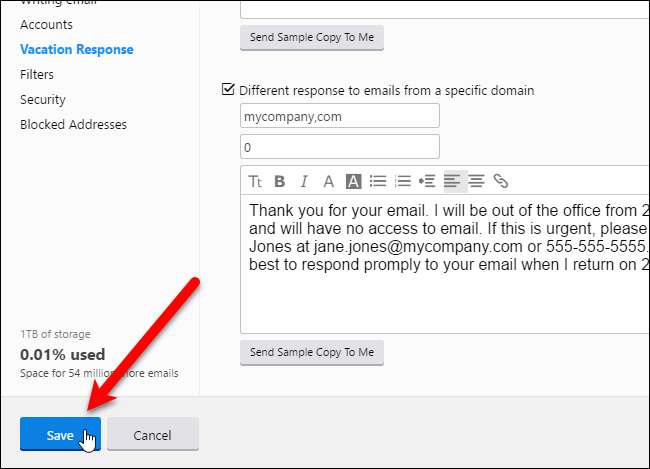 Kun olet määrittänyt lomavastauksesi, napsauta "Tallenna" -painiketta selainikkunan vasemmassa alakulmassa (saadaksesi uuden version Yahoo Mailista). Asetukset-näyttö sulkeutuu ja palaat Yahoo Mailin päänäyttöön.
