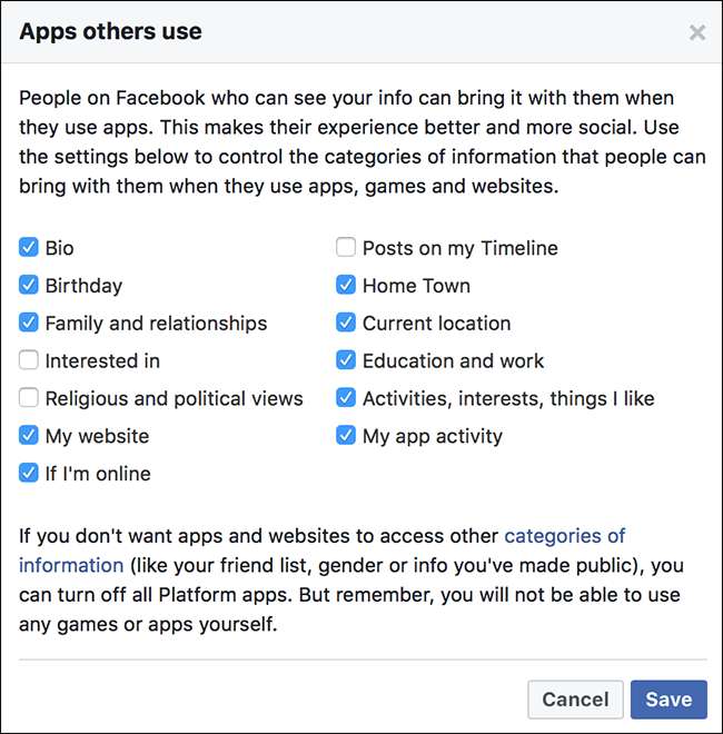 Tässä olevat valintaruudut hallitsevat, mitä kolmannet osapuolet voivat saada, kun ystäväsi kirjautuvat sisään sovelluksiinsa. Esimerkiksi, jos yksi ystävistäni oli kirjautunut tietokilpailuun (ja minulla oli asiat asetettu siten kuin ne näkyvät yllä olevassa kuvassa), Cambridge Analytica voisi saada minun elämäni, syntymäpäiväni, perheeni ja parisuhteeni, kotikaupunkini, nykyisen sijaintini , Koulutus ja työ, aktiviteetit, kiinnostuksen kohteet ja tykkäykset, sovellustoiminnan verkkosivusto ja riippumatta siitä, olenko verkossa. Se on helvetin paljon tietoa.