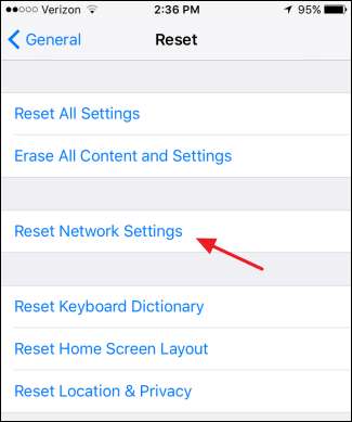 Jos mikään tähän mennessä suoritetuista vaiheista ei ole hoitanut ongelmaa, voit myös antaa iOS: n palauttaa kaikki verkkoasetuksesi. Voit lukea meidän Täydelliset ohjeet prosessille täällä , mutta lyhyt versio on tämä: siirry kohtaan Asetukset> Yleiset> Nollaa ja napauta "Nollaa verkkoasetukset".