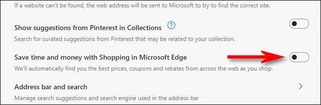 Vieritä alaspäin "Palvelut" -osioon ja käännä kytkin vieressä "Säästä aikaa ja rahaa ostosten kanssa Microsoft Edge" -toiminnolla ".