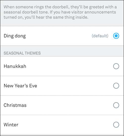 Nest Hello Video Ovikellon teema Asetus muuttaa ääniä ovikellosi tekee, kun se soi, samoin kuin kävijä-ilmoitukset Google Assistant -laitteissa. Kun loma on ohi, pesä on oletus takaisin perinteiseen "Ding Dong" -teema automaattisesti.