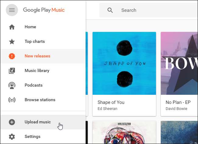 Voit ladata musiikkia suoraan verkkoselaimestasi olettaen, että verkkoselain on Google Chrome. Tämä on ihanteellista, jos lataat vain muutaman kappaleen (koko kirjaston sijaan). Sen Google Play Musiikki -sivusto , napsauta valikkopainiketta ruudun vasemmassa yläkulmassa ja napsauta "Lataa musiikkia".