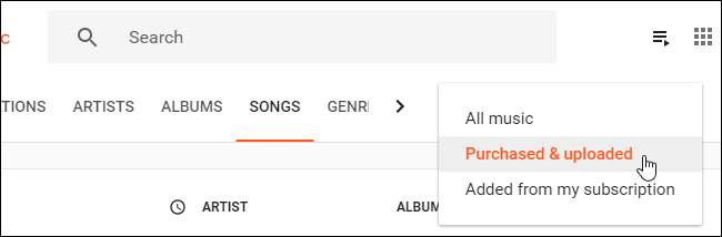 Jos haluat nähdä vain lataamasi kappaleet, napsauta kirjastoa Google Play Musiikissa ja valitse avattavasta valikosta Ostetut ja ladatut.