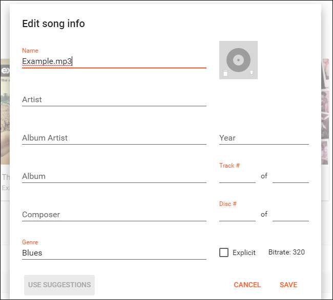 Jos lataamaasi kappaleeseen ei ole liitetty tagitietoja, voit lisätä sen itse. Napsauta kappaletta hiiren kakkospainikkeella Google Play -musiikissa, valitse Muokkaa tietoja ja kirjoita esittäjä, kappaleen nimi, albumin nimi ja muut tiedot, jotka haluat liittää kappaleeseen. Voit jopa lisätä albumikuvan täältä.