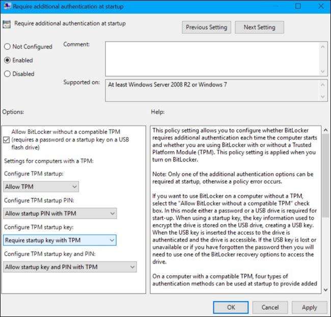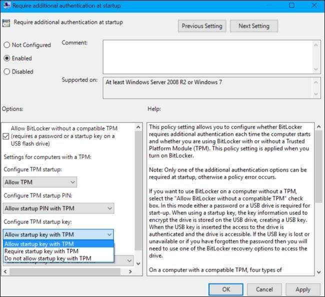 Jos muutat mieltäsi ja haluat lopettaa käynnistysavaimen tarpeen myöhemmin, voit kumota tämän muutoksen. Palaa ensin takaisin ryhmäkäytäntöeditoriin ja muuta vaihtoehto takaisin Salli käynnistysavain TPM: llä. Et voi jättää asetukseksi Vaatia käynnistysavainta TPM: llä, tai Windows ei salli käynnistysavaimen vaatimuksen poistamista asemasta.