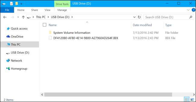 Avain tallennetaan USB-asemaan piilotettuna tiedostona .bek-tiedostotunnisteella. Voit nähdä sen, jos sinä näytä piilotetut tiedostot .
