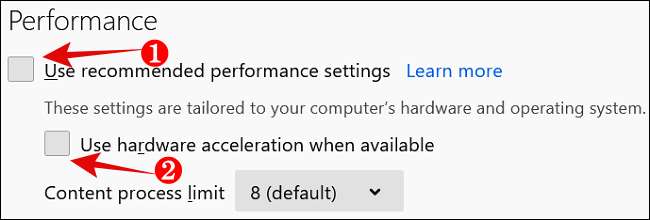 Selaa alaspäin Performance osiossa kunnes näet valintaruutu ”Käytä suositeltuja suorituskykyasetuksia” ja poista se. Joka paljastaa toinen valintaruutu ”Käytä laitteistokiihdytystä, jos mahdollista.” Poista sen valinta laatikko liikaa.