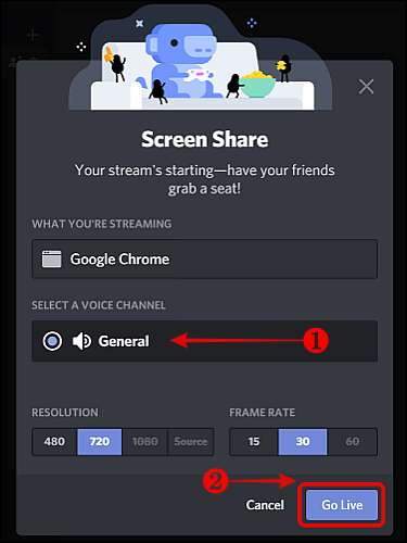 Näytön Share Settings -ikkuna avautuu. Sovellus valitsee automaattisesti 720P: n tarkkuuden sekä 30-kehys-sekunnin kehysnopeuden.