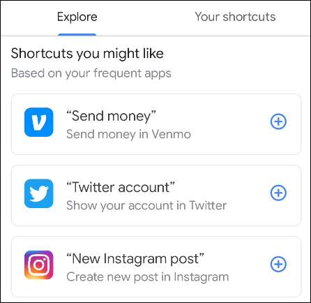 Pikanäppäimet jaetaan kahteen välilehteeseen: "Tutki" ja "pikavalinnat". Selaa "Explore" -välilehteä, jotta voit luoda joitain esimerkkejä pikakuvakkeita.