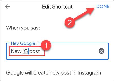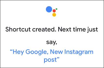Näyttöön tulee ponnahdusikkuna, joka selittää, että pikakuvake on luotu, ja se näyttää komennon, jonka haluat sanoa käyttää sitä.