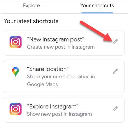 Näet kaikki pikavalinnat, jotka olet ottanut käyttöön "pikavalinnat" -välilehdellä. Jos haluat muuttaa komentoa, jonka sinun on sanottava pikakuvakkeelle, napauta lyijykynän kuvaketta.