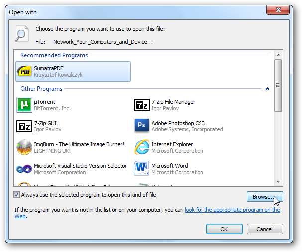 Tämä tuo esiin Avaa kanssa -valintaikkunan, jonka avulla voit valita, mistä avaat PDF-tiedostot, mutta valitettavasti Google Chromea ei ole luettelossa - mutta ei väliä, voit vain napsauttaa Selaa-painiketta.