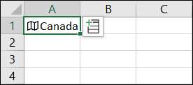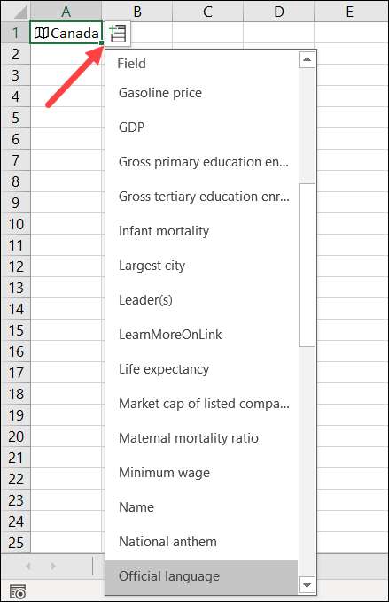 Napsauta solu, joka sisältää sijainnin nimeä tarvittaessa ja valitse sitten Insert Tiedot kuvake näkyy vieressä soluun. Tämä näyttää vieritettävän dataa josta voi tehdä valintoja. Tiedot saatavilla täällä riippuu siitä, millaista valitsemasi sijainnin. Jos esimerkiksi kirjoitat maa, näet enemmän vaihtoehtoja kuin olisit kaupungin.