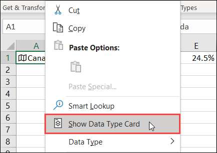 Yhdessä tiedot luettelossa, voit tarkastella mitä kutsutaan Data Type Card sijaintisi. Tämä antaa sinulle tilannekuvan tietoja tarrat. Nähdä se, vain hiiren kakkospainikkeella solua sisältävä sijaintisi, ja valitse sitten ”Näytä Data Type Card.”